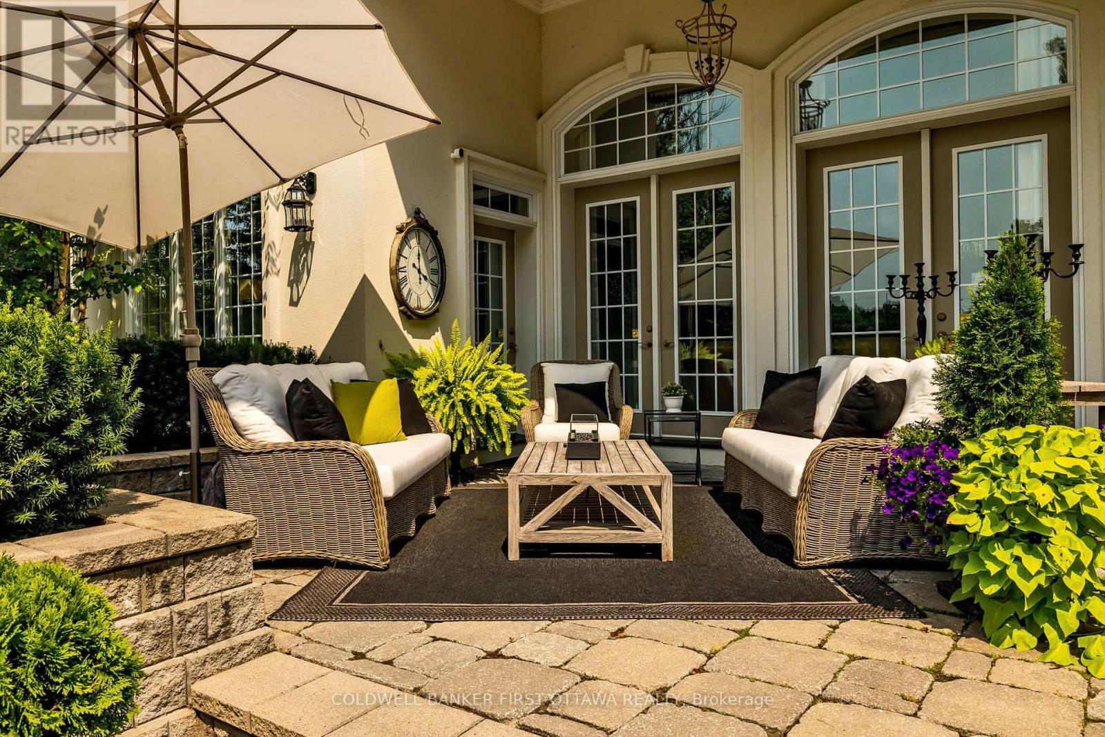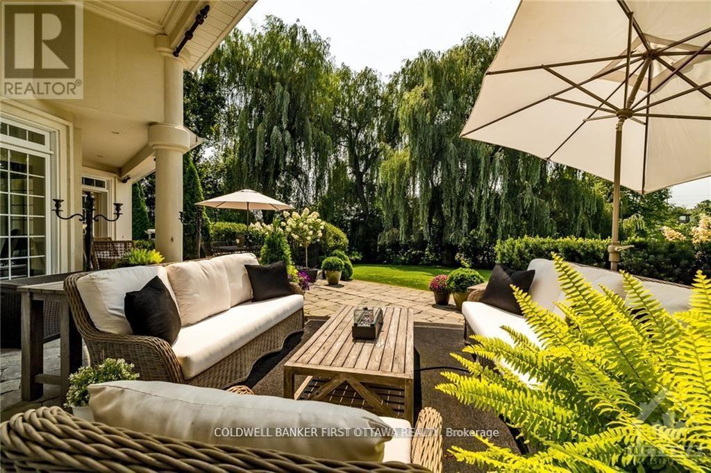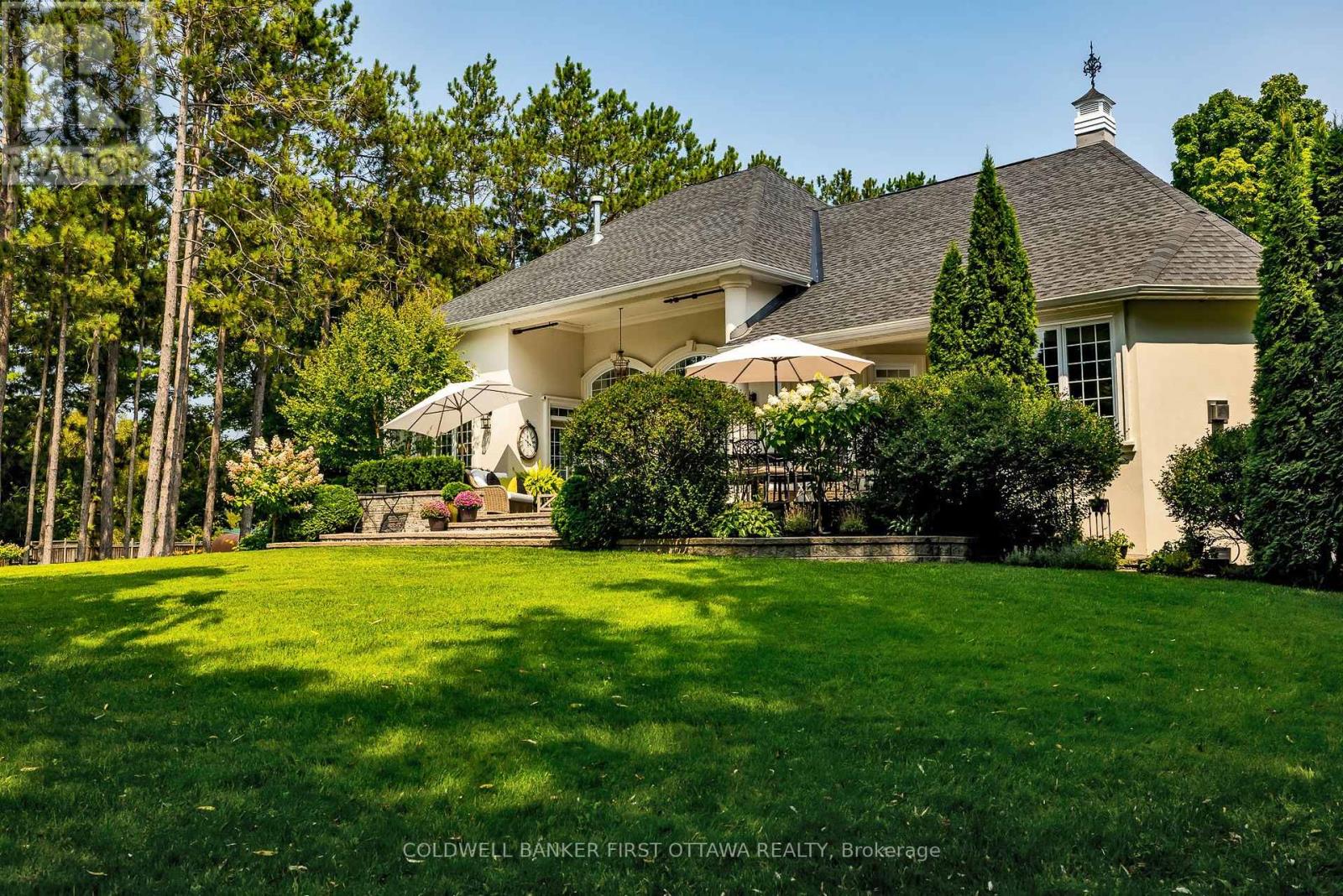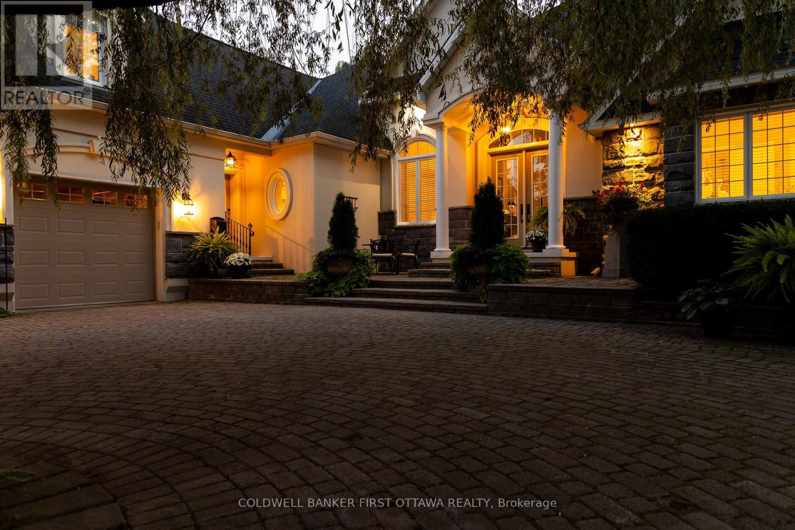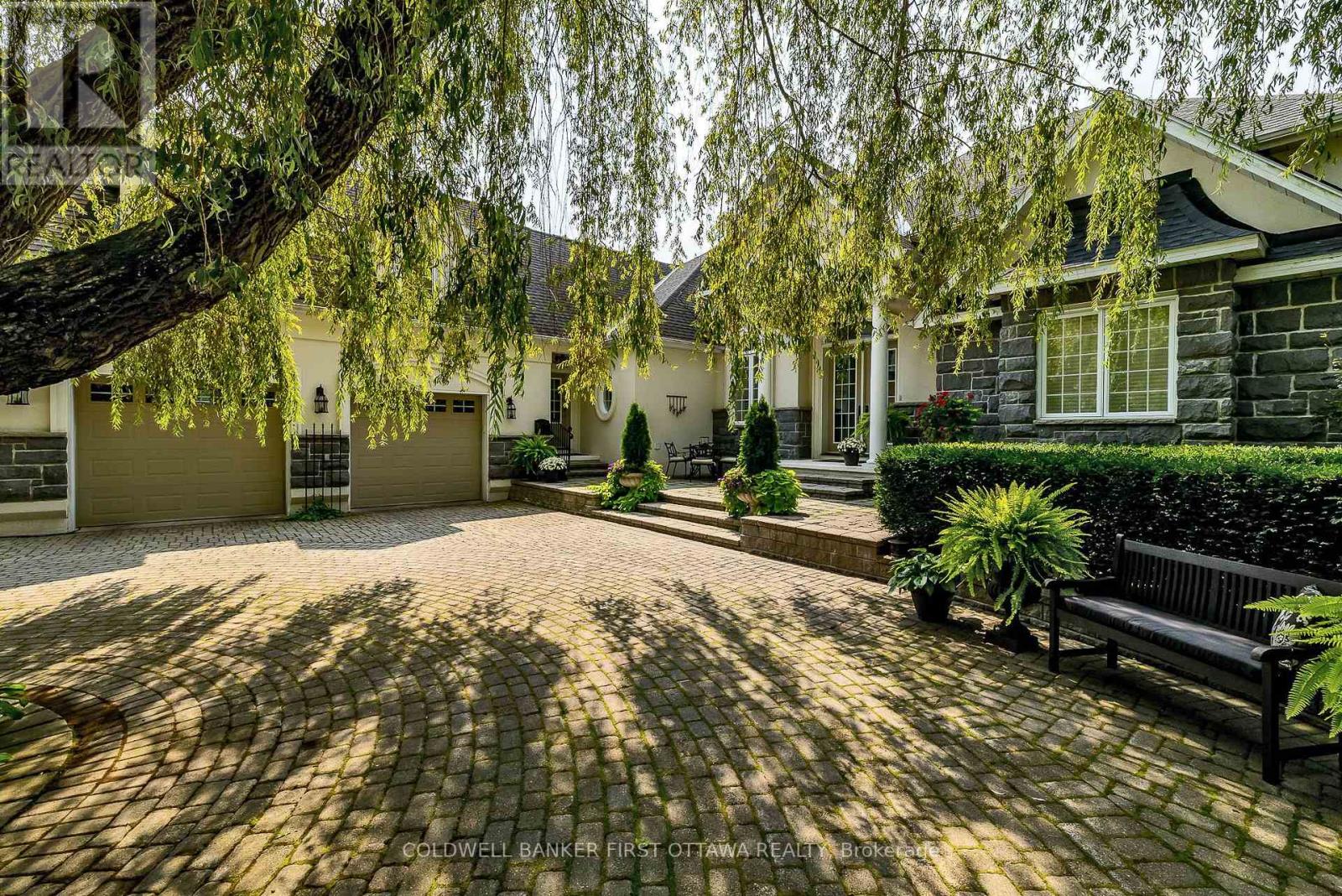 Experience unparalleled luxury in this meticulously designed home, just 15 minutes from Kanata, Stittsville and Manoticks central amenities. Nestled on a mature lot backing onto serene parkland and a gentle river, this estate boasts a picturesque courtyard with a sweeping driveway and weeping willow. Entertain effortlessly in the expansive great room with coffered ceilings and stunning hardwood, flowing seamlessly to multiple terraces. The sun-filled chef's kitchen overlooks a cozy family room and breakfast nook. Retreat to the primary suite with terrace access, a reading corner, custom fireplace, spa-like ensuite, and walk-in closet. The cohesive design extends from the upper-level guest suite with a coffee station to the lower level, featuring a games room, guest suite, fitness area, and workshop. Custom ICF construction, natural stone and stucco exterior, and top-of-the-line finishes make this home a rare find. (id:2469)