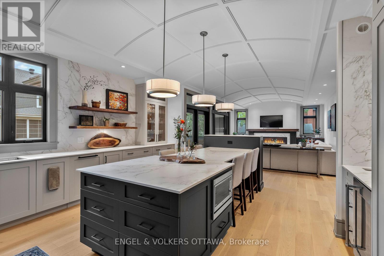 This high-quality, 3,500 sq. ft. custom home in the heart of Wellington Village is not only beautiful, the layout is functionally fabulous and features a rare double-height garage w/ reinforced floors, zoned HVAC and elevated ceiling heights. The entry is anchored by a dramatic 22 ft high foyer w/ custom walnut niche, walnut light fixtures, and heated porcelain floors that lead to an adjacent mudroom or the open-concept living & dining area featuring a floor-to-10-foot-ceiling-height fireplace clad in Dekton porcelain slabs & a custom staircase featuring walnut handrails and newel posts milled from a tree once on the property. At the heart of the home, a chef-inspired kitchen boasts a barrel-vaulted ceiling that extends thru to the connected family room, Dekton countertops & walls, 10 ft island, a beverage station & premium Fisher & Paykel appliances and an adjacent screened porch. Arriving at the second level, you're met w/ a 2nd barrel-vaulted ceiling, 9 ft high and four spacious bedrooms all with ensuite bathrooms & a nursery/office. The primary suite features his & hers walk-in closets & an ensuite w/ Dekton counters & shower surround, wood-accent shelving as with other bathrooms, & a free-standing tub. A well-appointed laundry room with a proper sink, quartz counters & ample storage. The lower level provides bonus living space w/ a sprawling recreation room w/ rough-in for a bar, a bedroom w/ an ensuite, a powder room, & heated flooring throughout. 8'-4" ceilings, w/ pot lighting & LVP wide-plank floors maintain the character of the home's upper levels. The remainder of flooring throughout the home is wide-plank, white oak engineered hardwood. The landscaped, fully fenced backyard includes an interlock patio, a cedar pergola-topped BBQ deck, defined garden beds & mature trees. Set on a tree-lined street in Wellington Village, this home is just steps from Elmdale Public School, Parkdale Market, and the shops, cafés, & restaurants of Wellington West & Westboro. (id:2469)