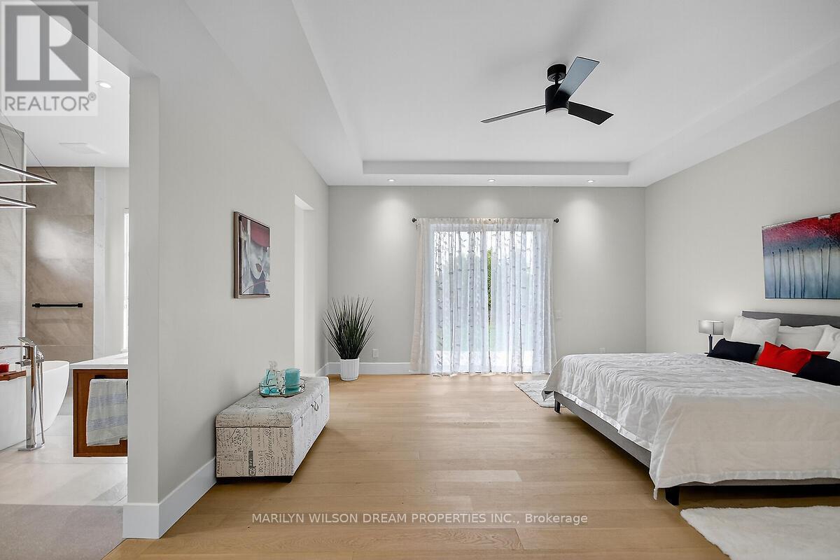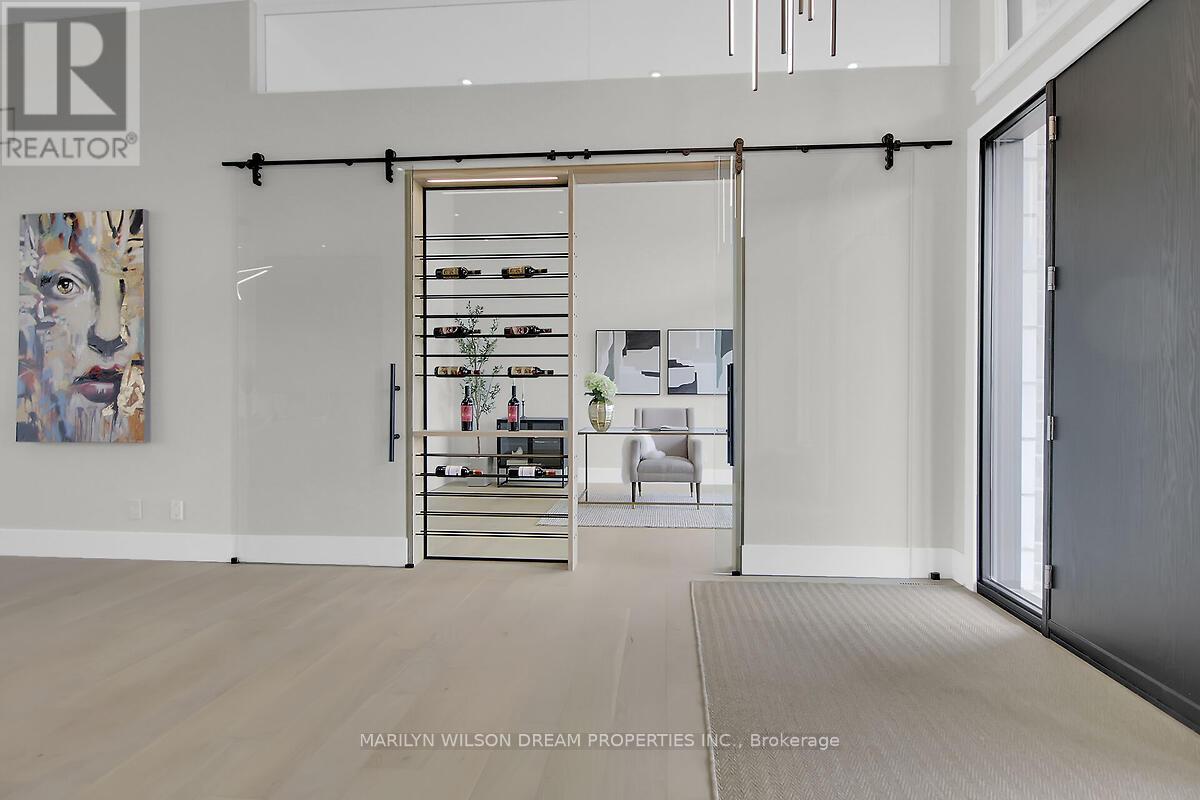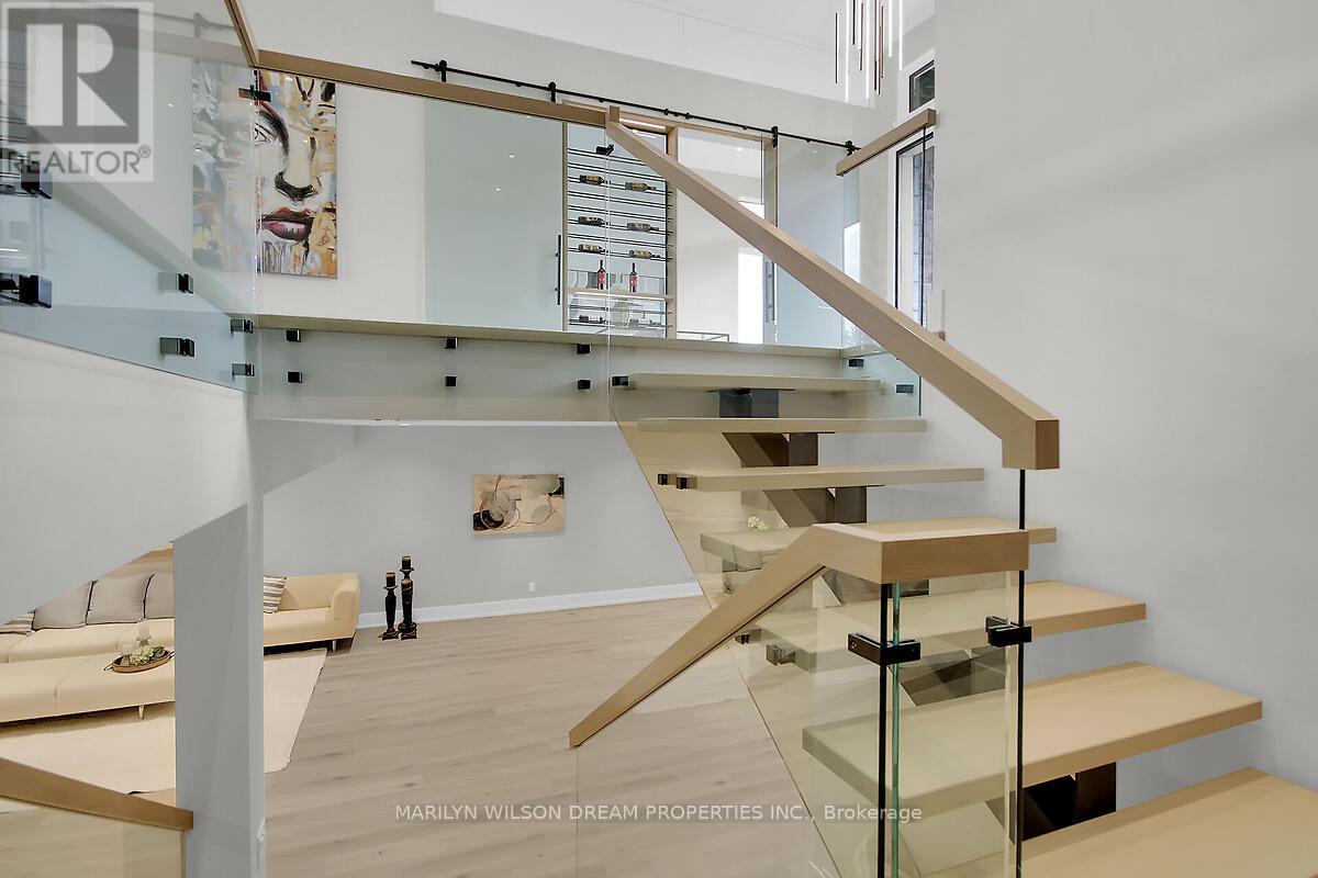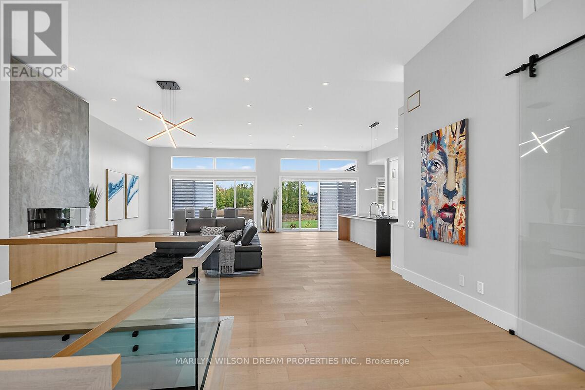 This custom designed bungalow offers both elegance and sophistication. Spectacular lot in estate subdivision with executive homes. Built by Patterson Homes, this residence has never been lived in! Attractive Dominion stone exterior and grand circular driveway. This breathtaking home is graced with magnificent scale, an abundance of natural light, high ceilings and an open floor plan. Whether you want privacy and relaxation or the perfect entertainment venue, this property is it! Step inside and the interior unfolds seamlessly with classic and contemporary design elements, offering a relaxed elegance. Flooring is 7" Vidar white oak hardwood and 30" x 30" porcelain tiles from Italy. This beautifully appointed home features a gourmet kitchen equipped with Fisher Paykel high-end appliances, a large quartz waterfall island, custom Louis L'artisan cabinetry and a butler's pantry. Flowing effortlessly into spacious living areas adorned with custom stone gas fireplace. Triple patio doors opening to the expansive hardwood deck, allowing for effortless indoor-outdoor entertaining. Elegant office with frameless glass sliding doors and custom wine display which can showcase 47 bottles. The primary suite boasts a spacious bedroom with patio doors to deck, a spa-like ensuite with a soaker tub, a walk-in double shower, dual vanities, heated floor and a custom walk-in closet. Two additional bedrooms with shared bath. Oversized mudroom with powder room and dog washing station. Solid maple floating staircase to lower level. High ceilings and in-floor radiant heating throughout. Spectacular 700 sq ft rec room with wet bar, fully sound insulated theatre, versatile bonus space perfect for fitness centre, 4th bedroom, full bath with sauna, powder room, ample storage and direct access from garage. Fully insulated massive 5 car garage features 14' ceilings and fast EV charger. Windows by Marlboro custom windows. Lutron lighting and networking wiring throughout. Tarion warranty include (id:2469)