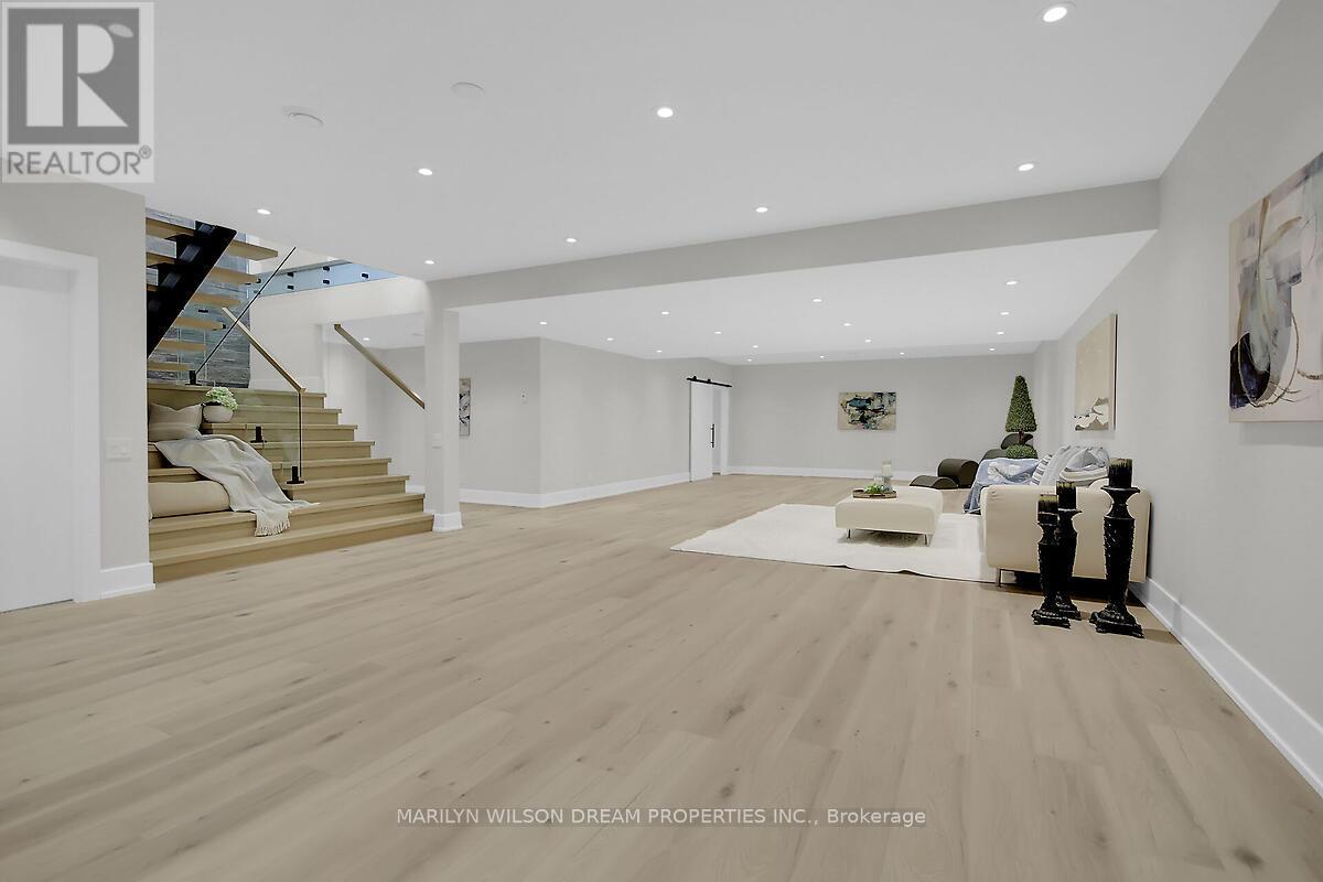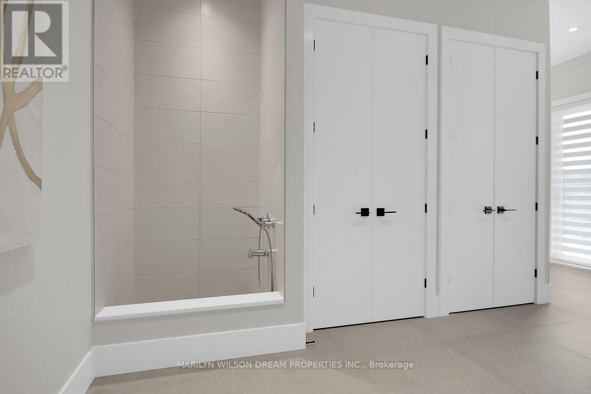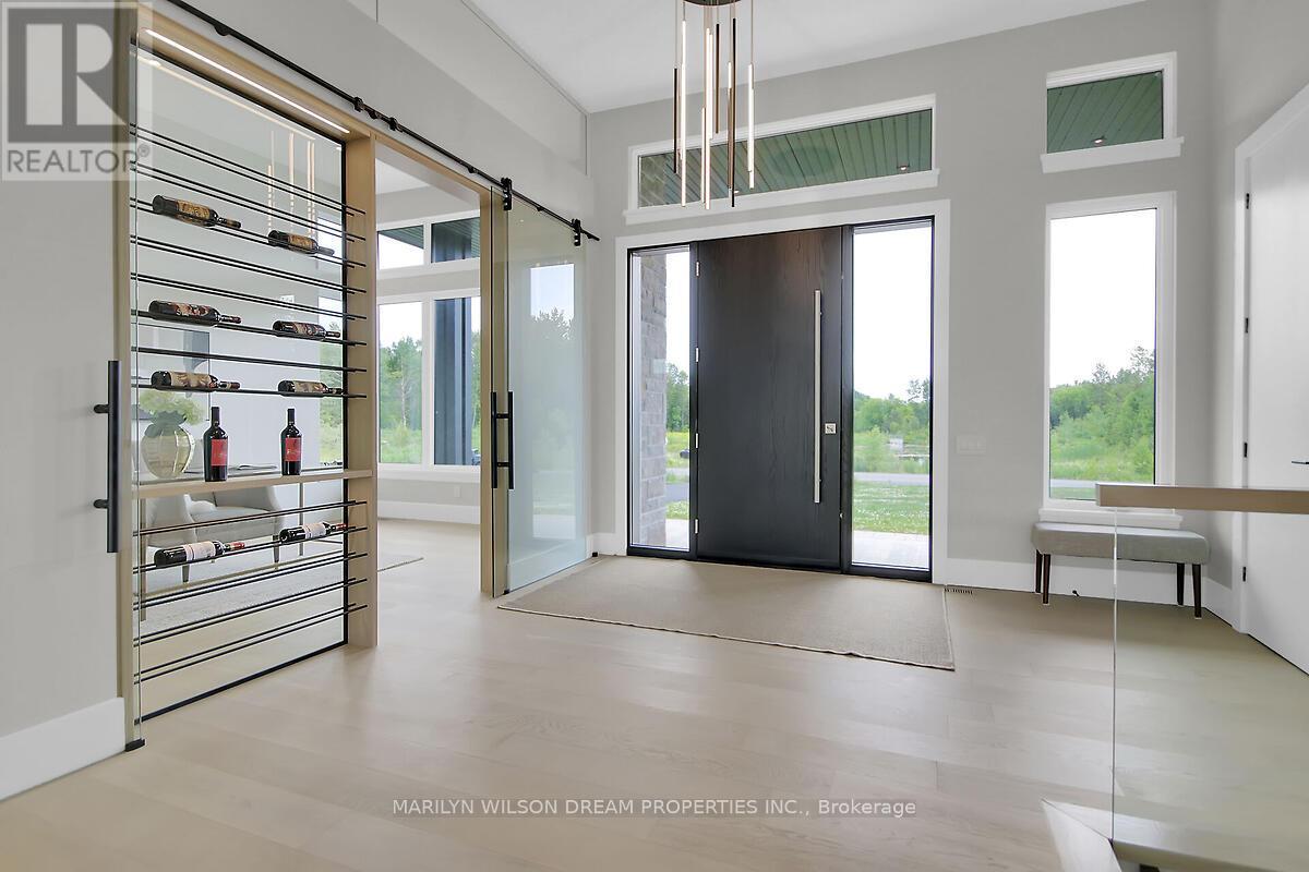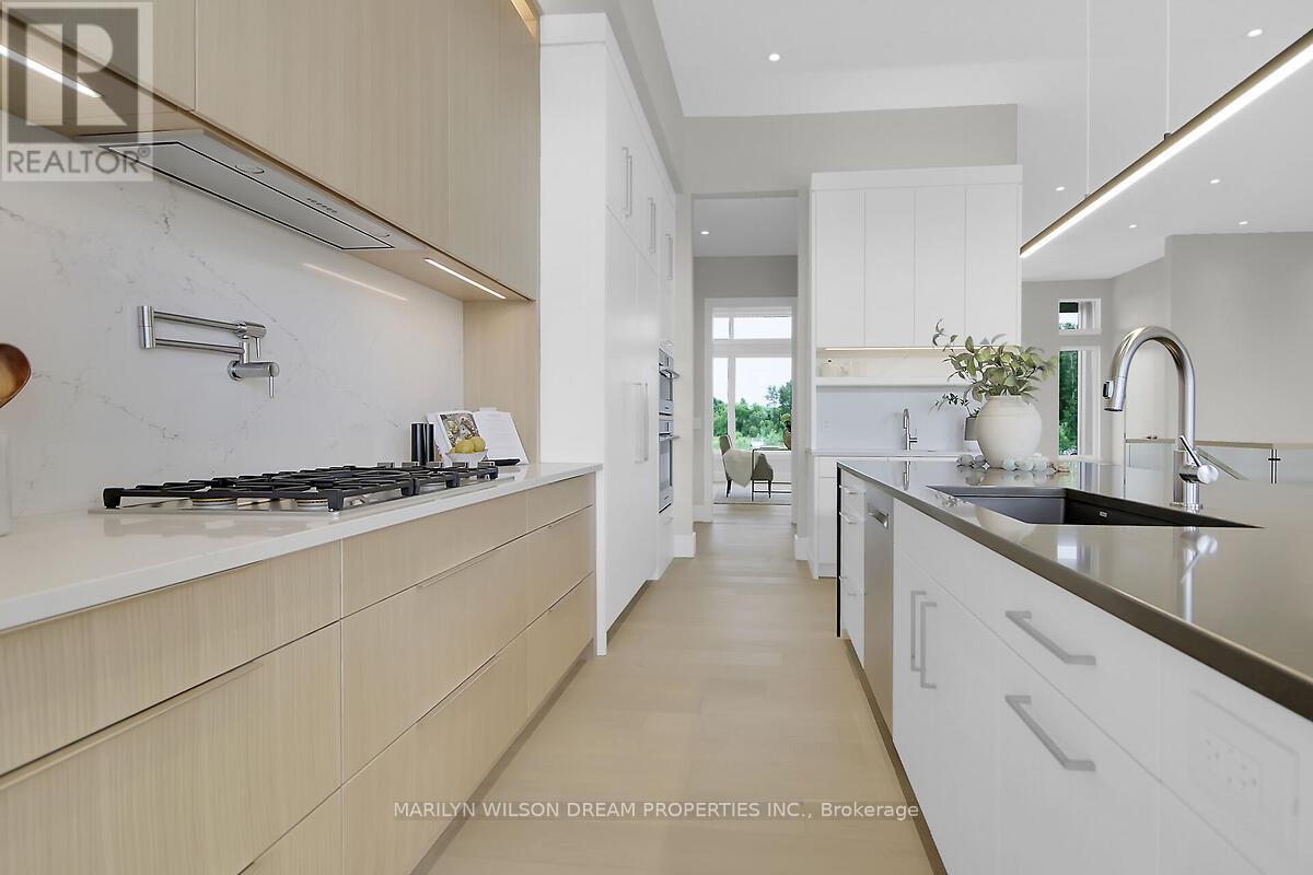 This custom designed bungalow offers both elegance and sophistication. Spectacular lot in estate subdivision with executive homes. Built by Patterson Homes, this residence has never been lived in! Attractive Dominion stone exterior and grand circular driveway. This breathtaking home is graced with magnificent scale, an abundance of natural light, high ceilings and an open floor plan. Whether you want privacy and relaxation or the perfect entertainment venue, this property is it! Step inside and the interior unfolds seamlessly with classic and contemporary design elements, offering a relaxed elegance. Flooring is 7" Vidar white oak hardwood and 30" x 30" porcelain tiles from Italy. This beautifully appointed home features a gourmet kitchen equipped with Fisher Paykel high-end appliances, a large quartz waterfall island, custom Louis L'artisan cabinetry and a butler's pantry. Flowing effortlessly into spacious living areas adorned with custom stone gas fireplace. Triple patio doors opening to the expansive hardwood deck, allowing for effortless indoor-outdoor entertaining. Elegant office with frameless glass sliding doors and custom wine display which can showcase 47 bottles. The primary suite boasts a spacious bedroom with patio doors to deck, a spa-like ensuite with a soaker tub, a walk-in double shower, dual vanities, heated floor and a custom walk-in closet. Two additional bedrooms with shared bath. Oversized mudroom with powder room and dog washing station. Solid maple floating staircase to lower level. High ceilings and in-floor radiant heating throughout. Spectacular 700 sq ft rec room with wet bar, fully sound insulated theatre, versatile bonus space perfect for fitness centre, 4th bedroom, full bath with sauna, powder room, ample storage and direct access from garage. Fully insulated massive 5 car garage features 14' ceilings and fast EV charger. Windows by Marlboro custom windows. Lutron lighting and networking wiring throughout. Tarion warranty include (id:2469)